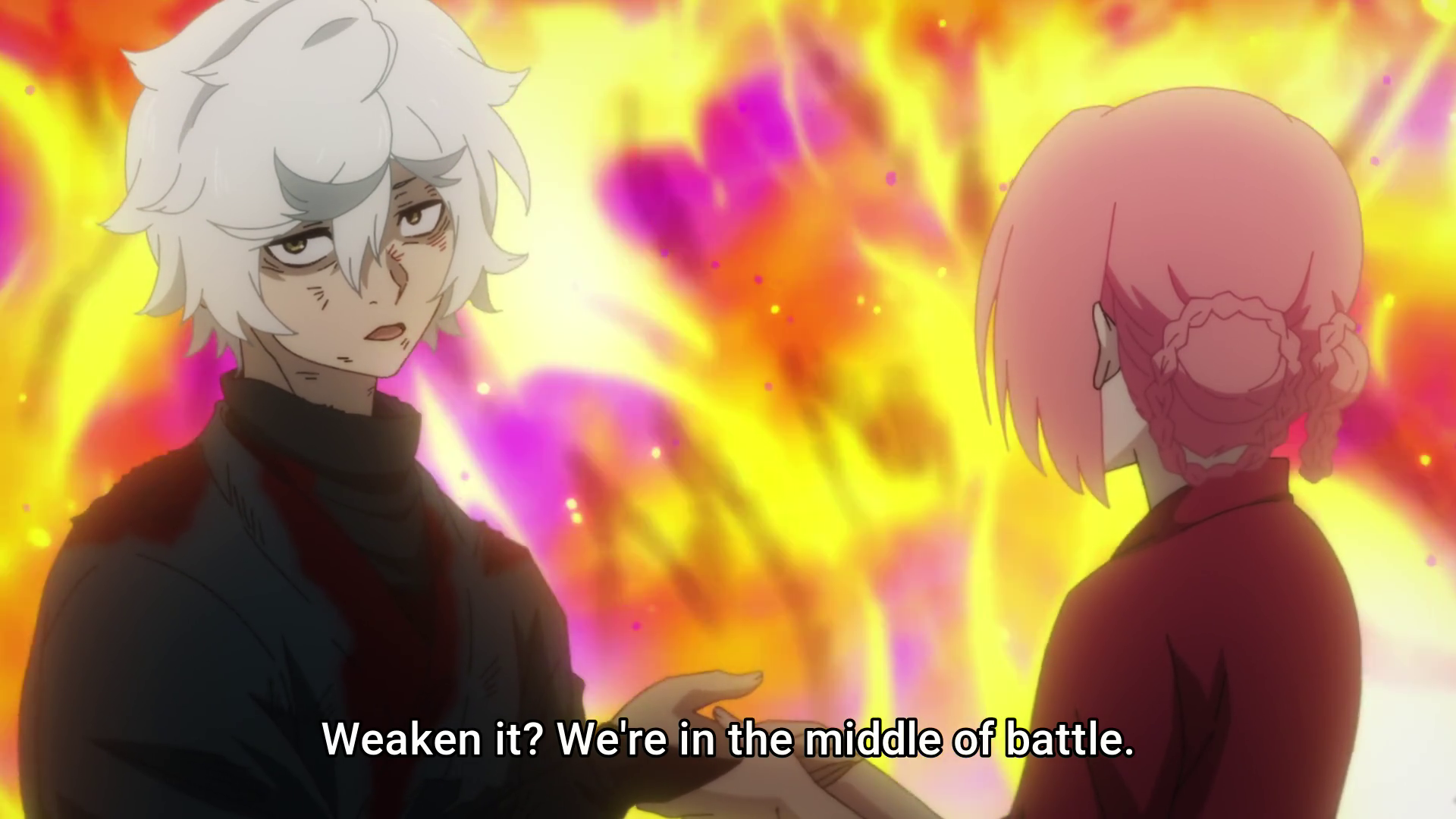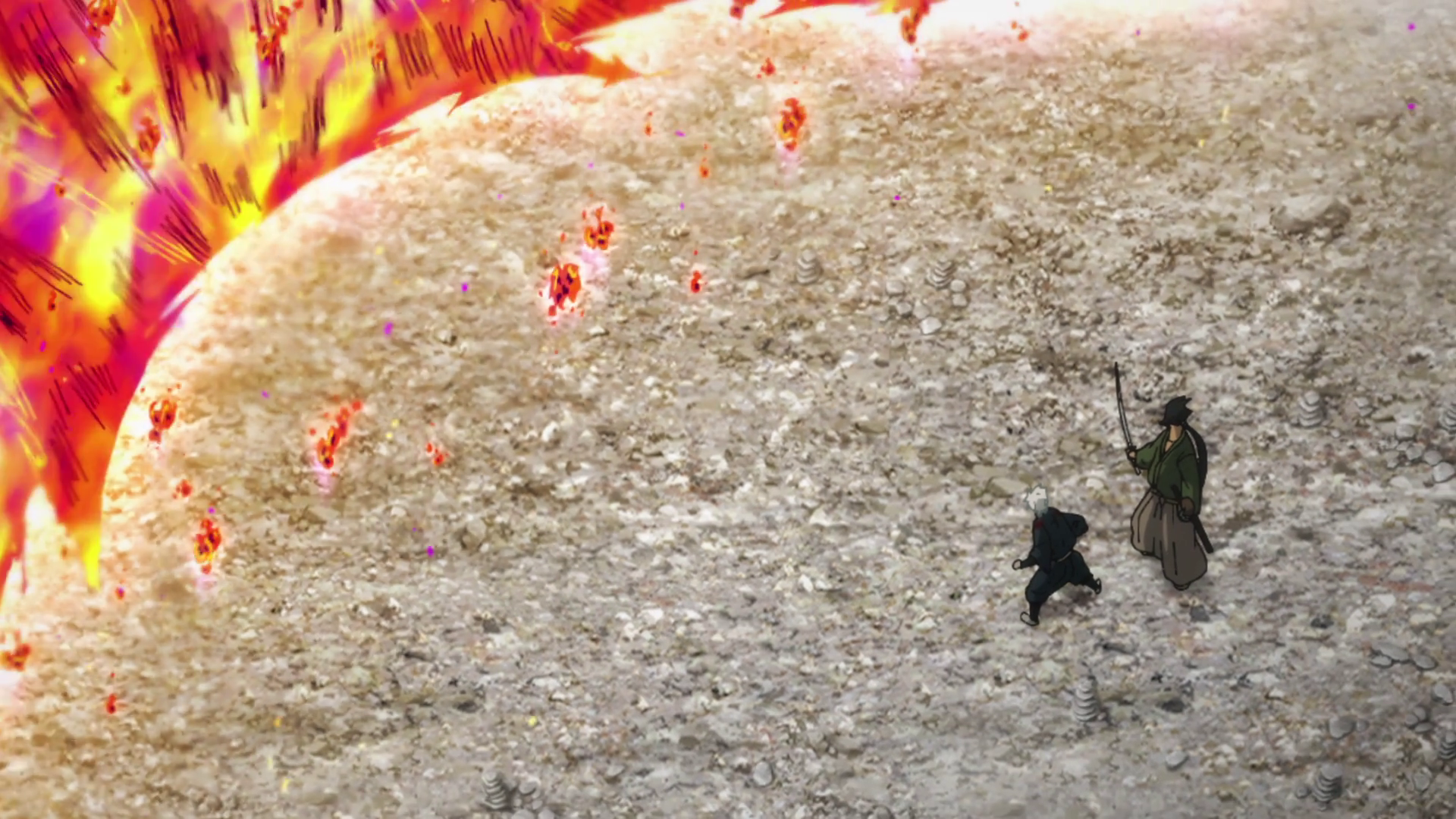 This goes on for so long I almost expected them to wheel out a chalkboard and some chairs. Then the fight gets going again, but we need some time for Gabimaru to learn how to use tao from Mei. So he puts up a wall of fire.