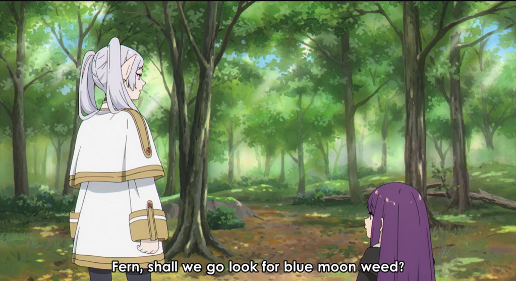 Frieren spends years translating the grimoire Heiter requested. During this time she teaches Fern the basics of magic, and Fern takes to the subject matter with a quiet fervor. After Heiter’s passing, Frieren and Fern travel to a small town that has a statue of Himmel. The statue has been neglected in the time that’s passed since it was erected due to the citizens forgetting Himmel and Co.’s deeds. Frieren takes it upon herself to plant the elusive blue moon weed flowers around the statue, much to the chagrin of Fern.
