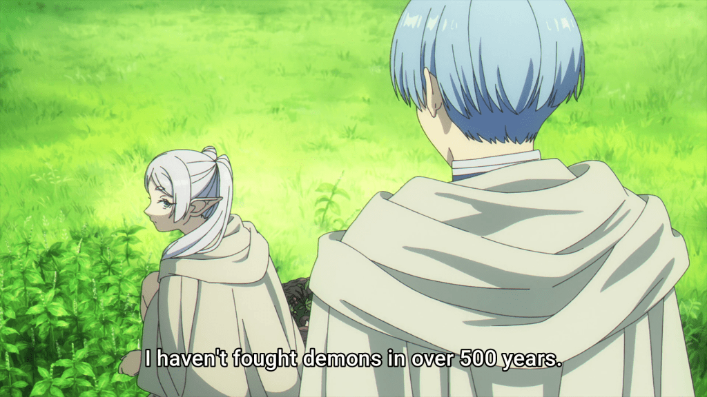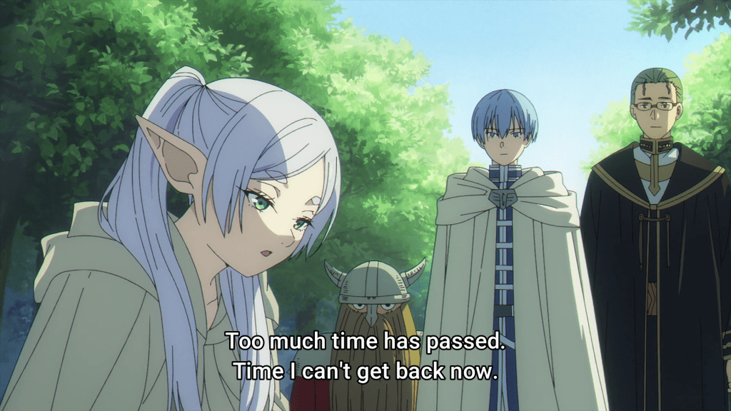But rather than get into those, there is one point that interested me about the episode, and that was Frieren’s own history of having the same thing happen – feeling like she couldn’t go out adventuring, that this was an opportunity she didn’t pursue and now had lost the chance at – 80 something years ago.
