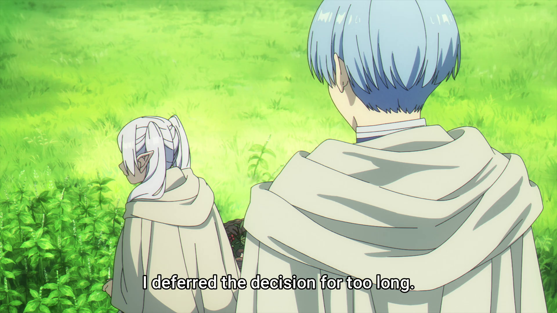 What’s interesting here is that this is the same scene (Himmel and company come to recruit Frieren while on their journey) that we saw back when we were learning about why Frieren is able to defeat Aura (she’s spent her whole life both suppressing and building up her mana to be the perfect demon-killer). In the episode with Aura, this long and quiet life of mana buildup had been proscribed by Flamme as a way to be that secret weapon – attain enormous hidden mana and don’t make a name for yourself. In this episode, instead, that long and quiet life is the reason Frieren feels she is unable to join the party at all.