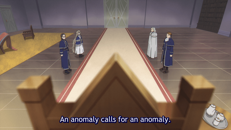 Another weird piece of commentary appears in the discussion amongst the first-class mages where Serie blames Frieren’s raw power for allowing too many applicants to complete the second test – it’s a clean segue into the topic of mana suppression, which leads to some important plot points, but I feel like the assessment itself is… demonstrably incorrect? It might well have been true in a test that didn’t scale to the players candidates, but I consider Frieren’s presence there to have provided a net handicap by requiring both herself and Fern to engage her replica, preventing Fern from being useful elsewhere (sound off in the comments if you’ve put a lot of thought into how that test could have gone differently without her – I don’t feel like she contributed substantially to overall strategy, either, but there’s room for speculation about how the replicas would have otherwise been deployed).