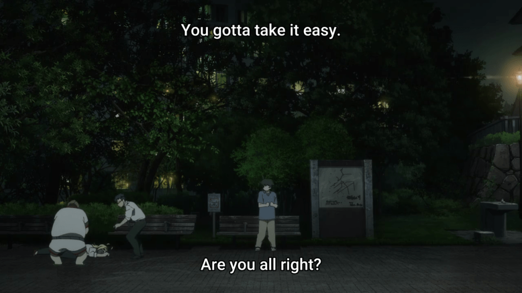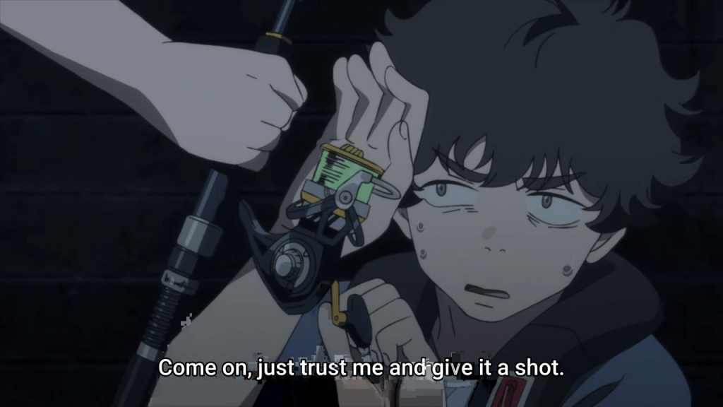 For a show with angler in the title, there’s a surprising amount going on in this show besides the fishing. The first episode covers a LOT of ground, but to its credit I didn’t feel much in the way of whiplash. Which is impressive, given that very nearly the first thing we see is Sasaki trying to hang himself in his apartment as we flash back to his diagnosis.