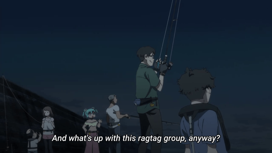 I like them already, and the show had moved from a very serious start to pretty funny without it feeling dissonant. In the second half, Sasaki is pulled from the water by the group of anglers from the top image, led by this guy.