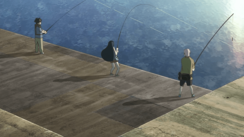 With nowhere to go (the anglers are out on a breakwater) and a very energetic proponent of fishing coaxing him, Sasaki eventually, grudgingly, gives fishing a try.