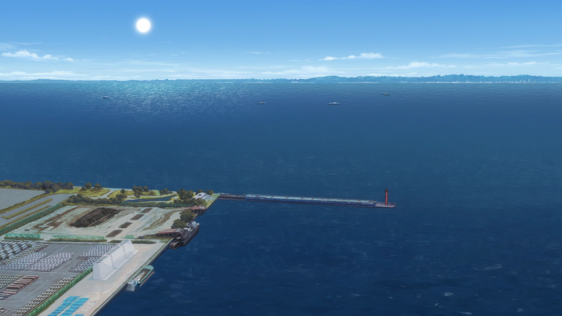 Near as I can figure, the “Shoukoku Sea Fishing Facility” that the gang drives out to for this episode is based on the actual Daikoku Sea Fishing Facility (Park?) on the Yokohama coast. Compare the satellite photos of your choice to this establishing shot: