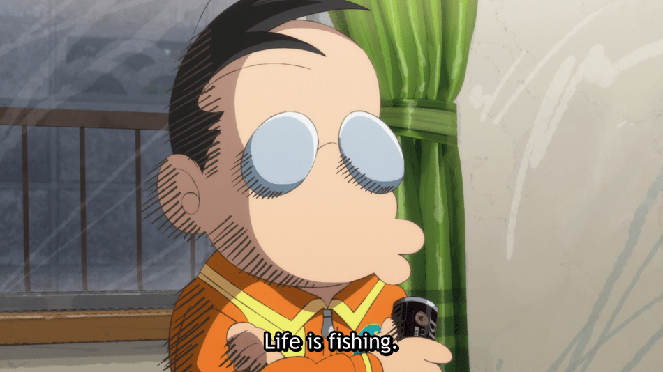 Apropos of nothing, something I never had a good opportunity to mention is that I can’t look at Ice (who continues to be present in this episode) without seeing a mashup of several of the characters from Muromi-san on the Shore. It’s not really a fishing anime, although it is mostly about a guy being harassed by mythical weirdos while he goes fishing, so… there’s a little overlap – enough that I feel comfortable believing that Angler’s character designer, Taniguchi Hiromi, has carried a piece of that strange little show with him, consciously or not, ever since he worked on an episode of it over a decade ago, when he was much lower on the totem pole.