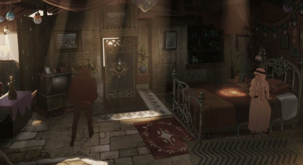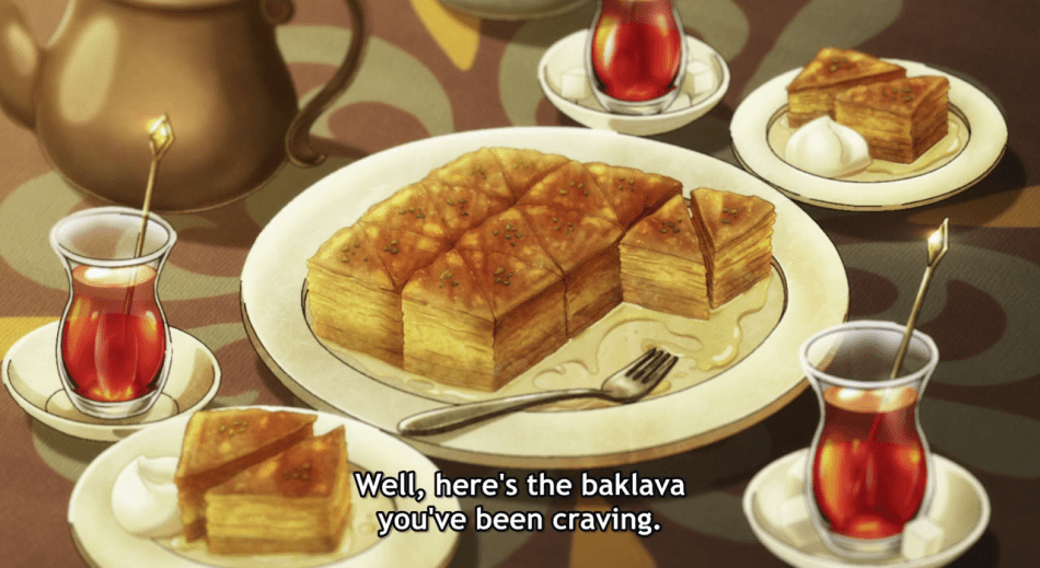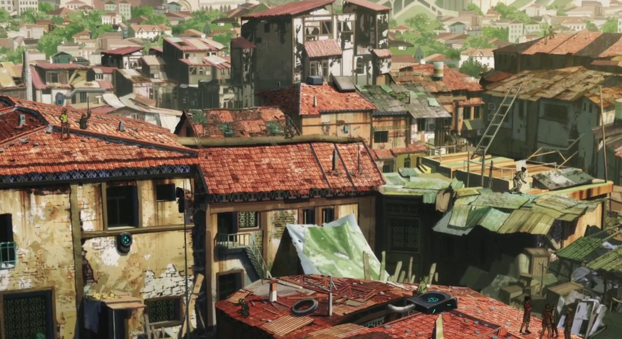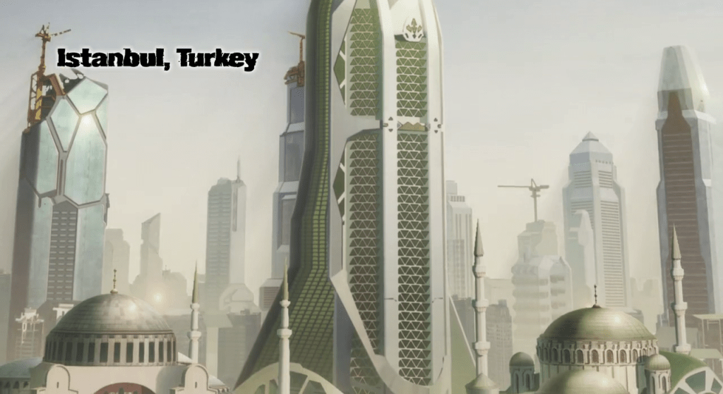 This is a real whirlwind of an episode; it’s impressive how much ground the show can cover. Even more impressive is that while this rapid pace does a good job getting across the feeling of the characters racing against the clock, the show itself doesn’t feel rushed. I don’t feel bombarded with new information too quickly to keep up. Thinking about it, I think the very high level of visual detail in the backgrounds is helping a lot. For example, there is an establishing shot of Istanbul as the characters arrive. The downwards pan starts here: