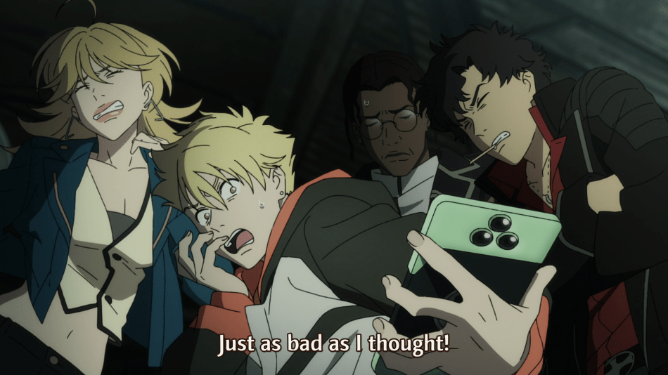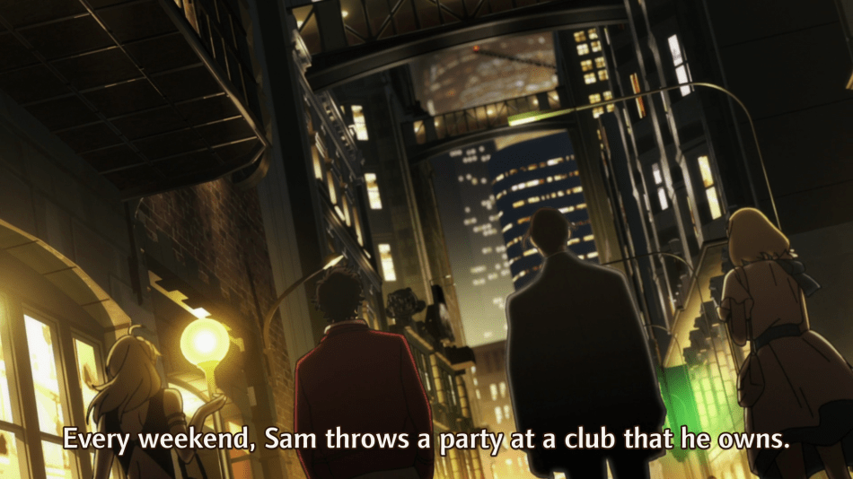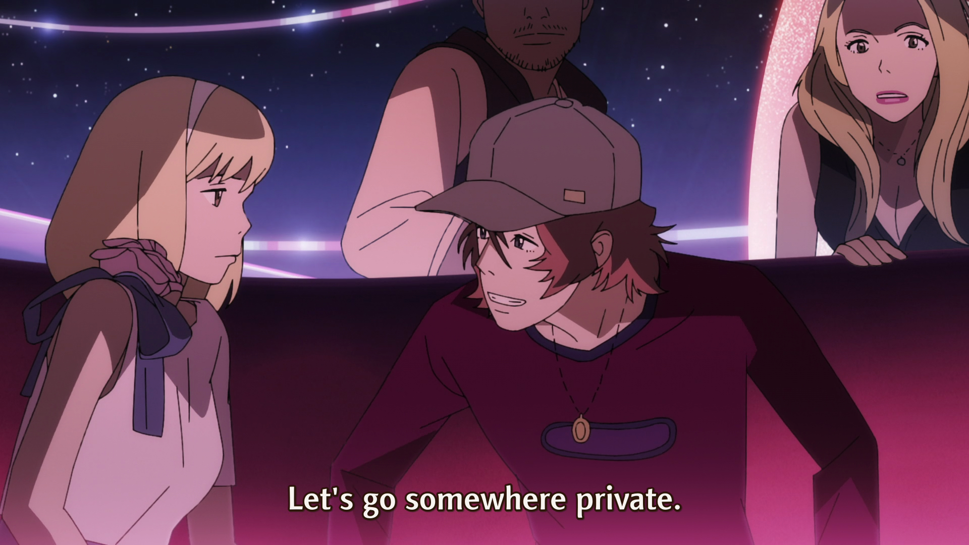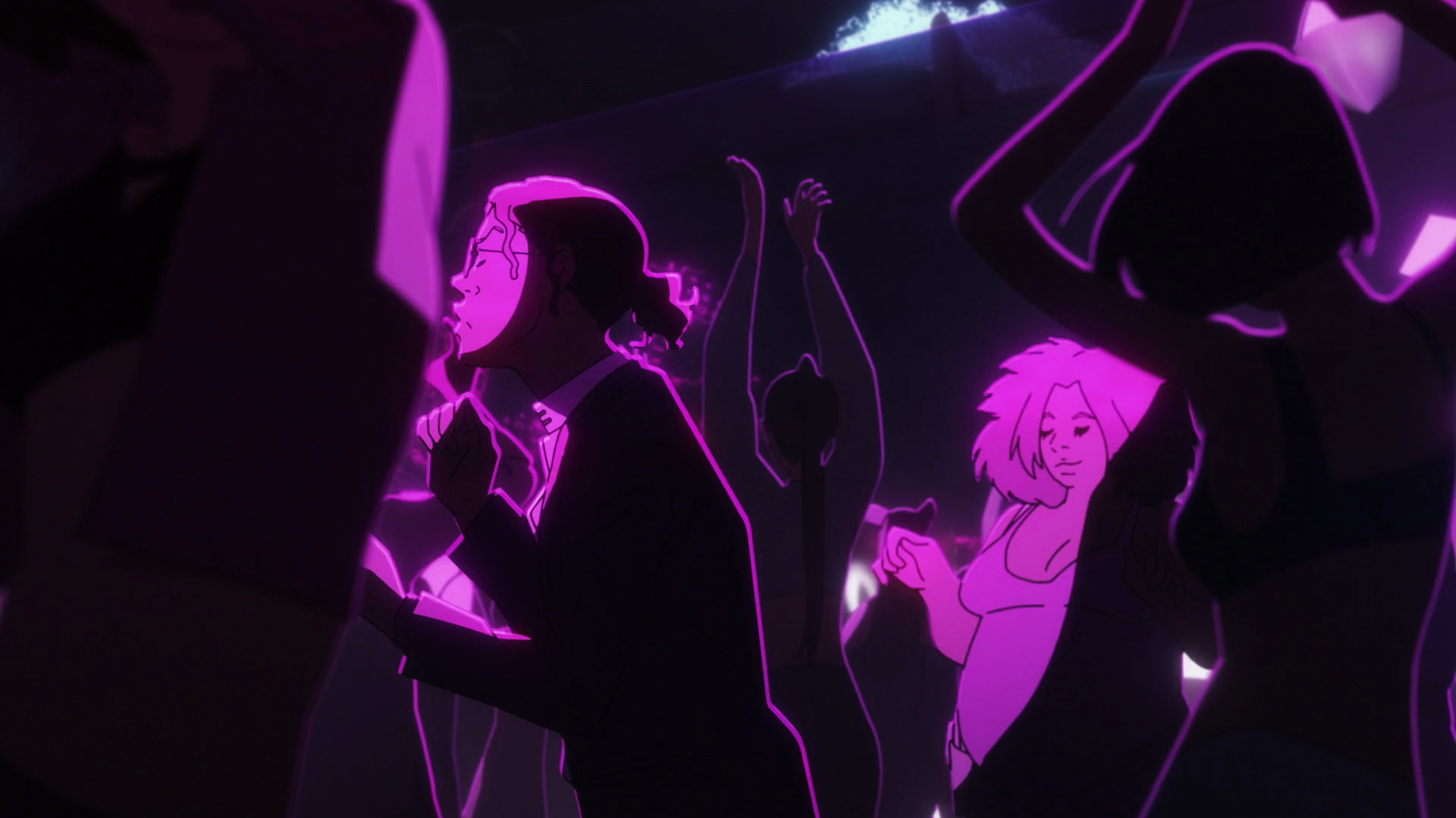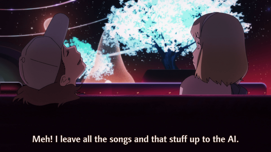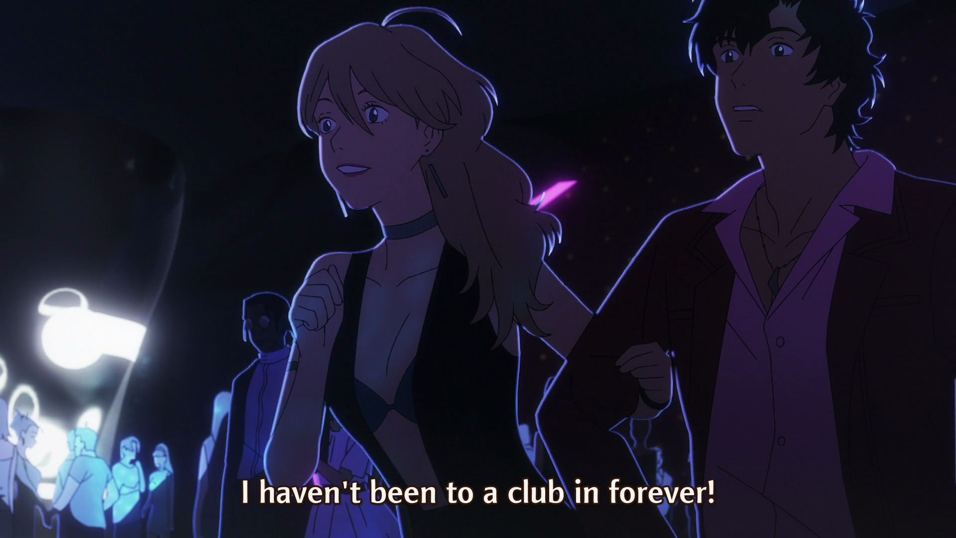 I put Velocity’s title as “DJ” in quotations because he’s a fraud. If you are old enough to remember Ronny Matthews from Hey Arnold!, it’s that all over again with a splash of the modern day specter; AI. AI apparently runs most vehicles, pilots drones, and oh yeah…makes and plays popular music from a for you. Many of these things are already in effect in our modern world so I am highly unsettled by how familiar it is. Sam’s insane party is in sharp contrast to Episode 03 with the homeless commune. This also translates artistically. Unlike the commune, which was mostly drawn in traditional 2D with muted browns, Club 8 Miles High is very high gloss and almost all in CG. It fits the mood and the plot (we’re chasing hackers and discussing stock trading/other technology related things) and I love the juxtaposition. Something that’s tangentially disturbing in this story is how there’s the imminent threat of mass death and those with vast resources spend them on booze, drugs, and date-rape. I can feel the cynicism towards influencers and those who drink deep from the Capitalist well in this writing.