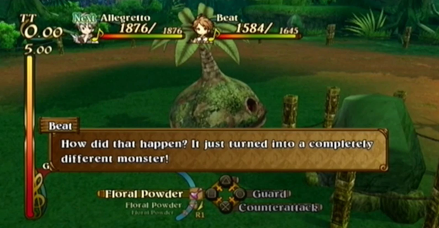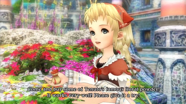 Opening cutscene, followed by meeting our two sets of protagonists – Polka and Chopin, and Beat and Allegretto. Polka is a young girl who can use magic, which in this world means she will soon die of an incurable illness. She lives with her mother in Tenuto Village, and travels to nearby Ritardando to sell floral powder, a curative. However, mineral powder, a “government-approved miracle drug”, has gained popularity due to high taxes on everything else, including floral powder. That, combined with people being afraid of catching her disease (though it is not contagious), has made her a fairly depressed little girl. After meeting Chopin, she resolves to go talk with the Count of Forte, so he will lower the taxes on floral powder.