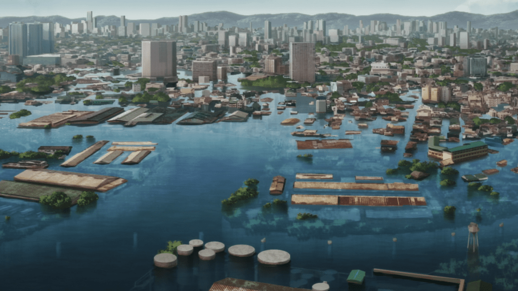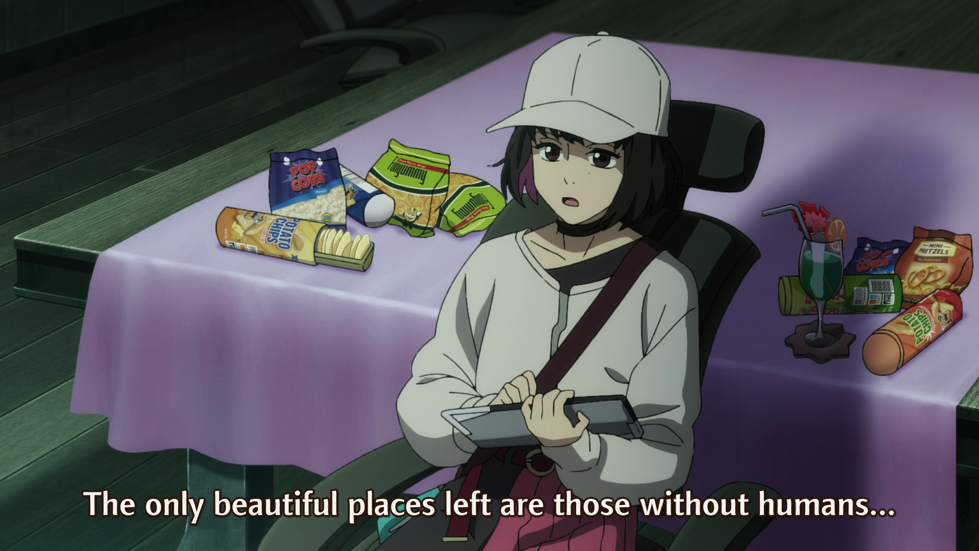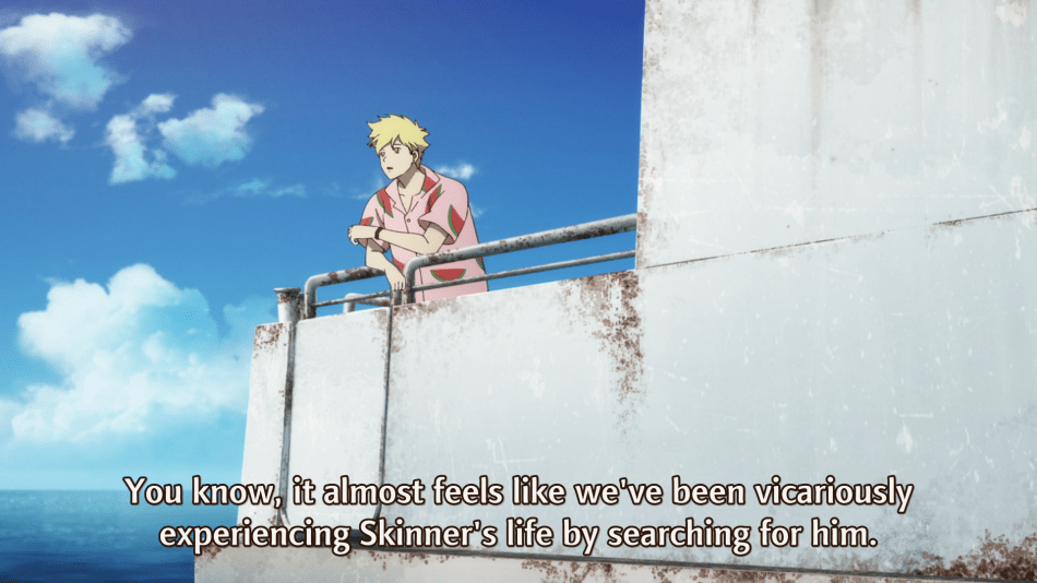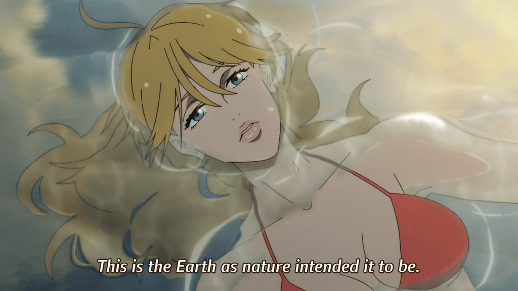This segues me nicely into talking about the art as a whole. I think I’ve settled on the idea that this show puts lots of effort into scenery and backgrounds, as it really sells the worldbuilding. Shots of humans are basic at best and slightly janky with minimal or no facial features at worst. In a way it’s almost complimentary to the show’s message about Skinner’s feelings on humanity versus the beautiful Earth we inhabit. I’m sure that’s not the intention but I draw a parallel regardless. Musically, the show is a little too on the nose for me here. The melancholy choral music that depicts both wonder and sadness is perfect, but a touch…too perfect I guess? I would have expected something more subtle to allow the viewer to decide what they want to feel about the natural beauty of these underwater areas that used to be inhabited by humans.