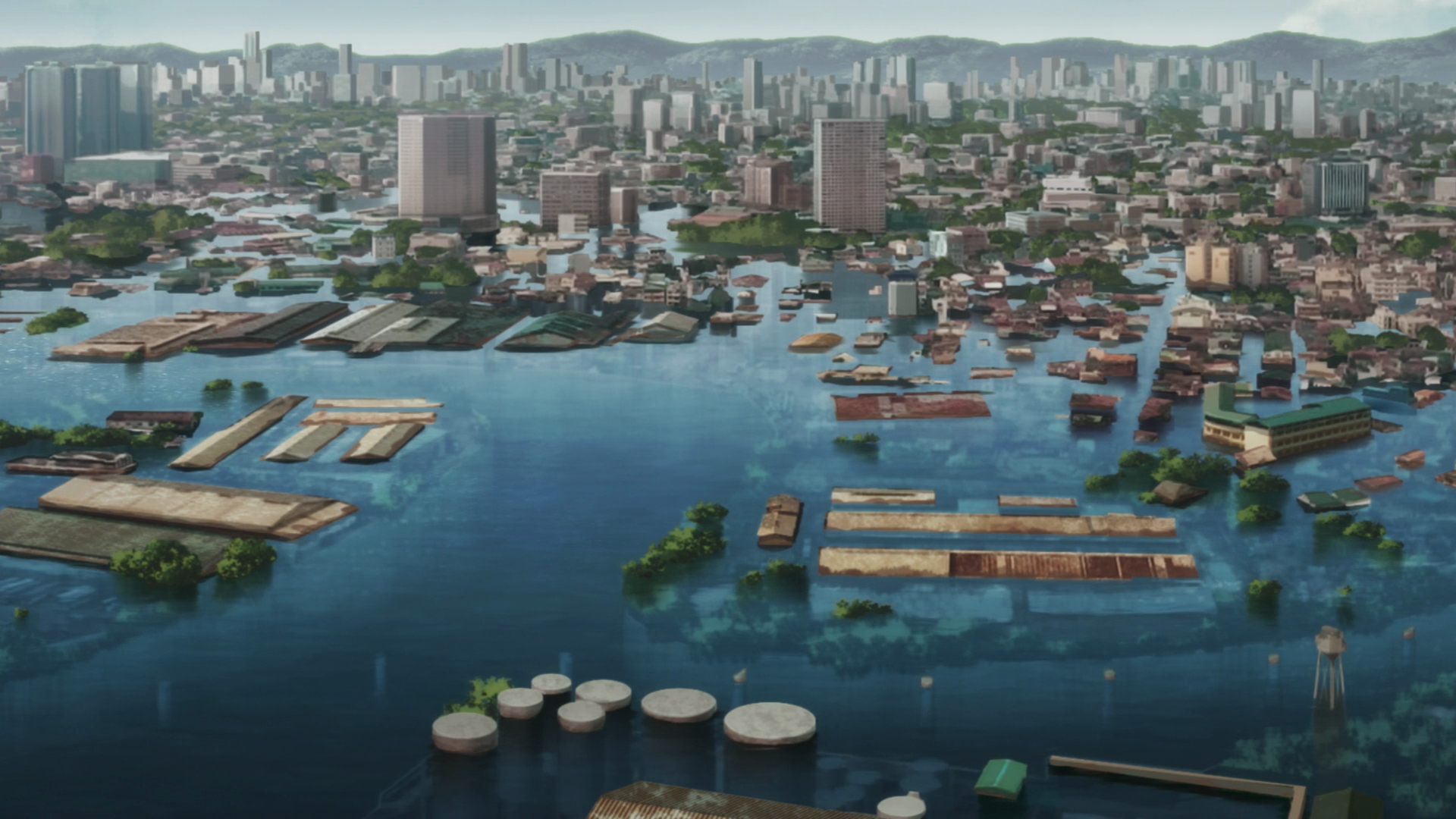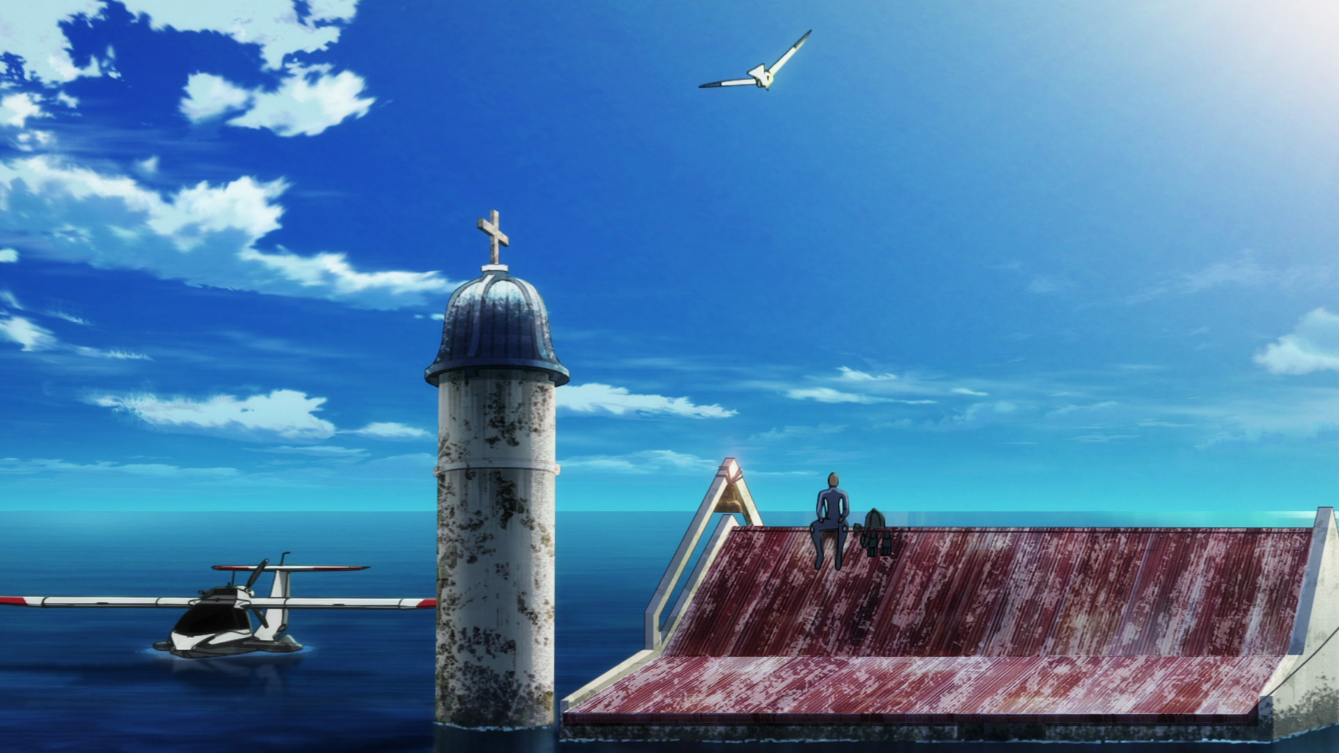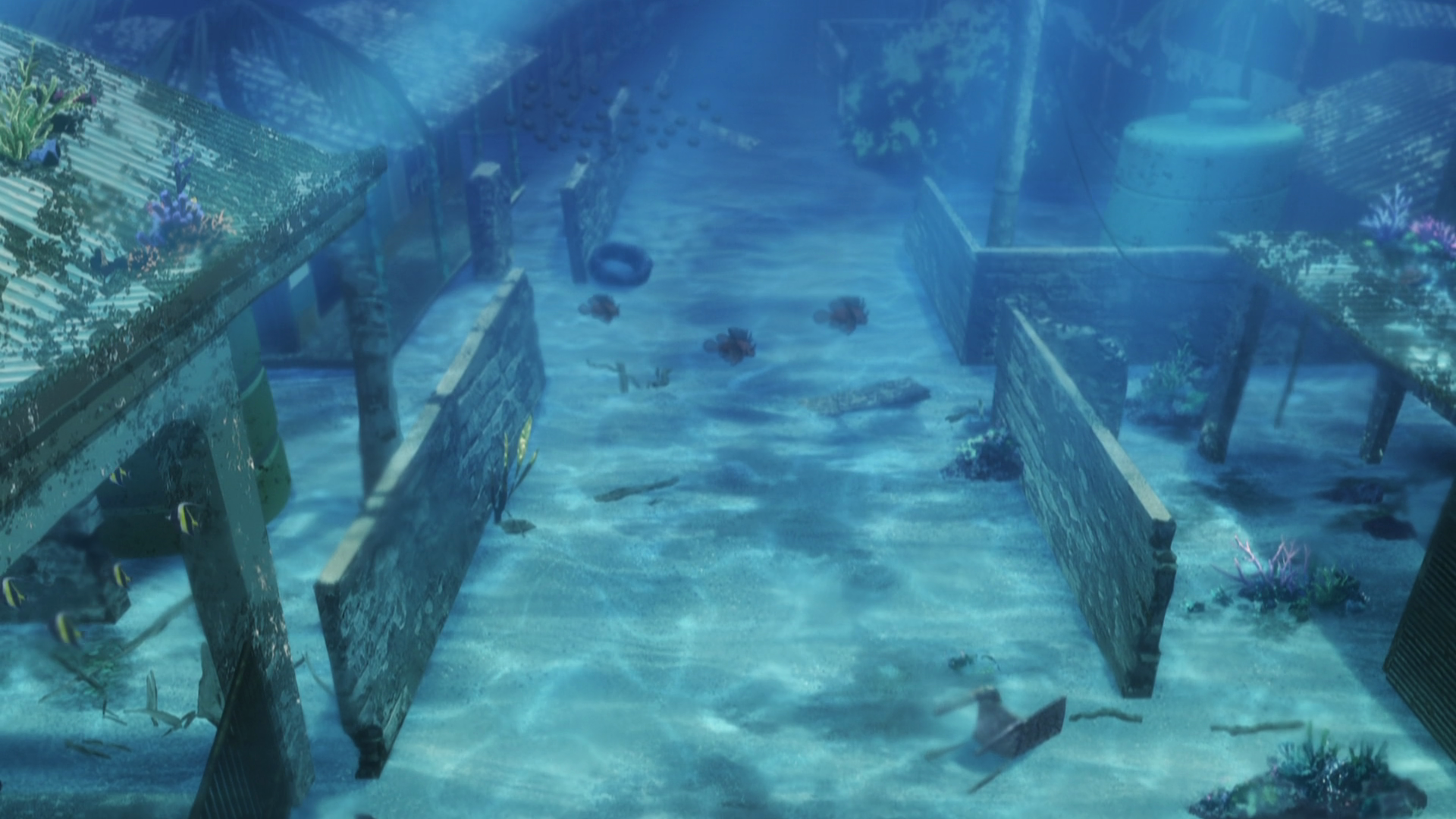 This segues me nicely into talking about the art as a whole. I think I’ve settled on the idea that this show puts lots of effort into scenery and backgrounds, as it really sells the worldbuilding. Shots of humans are basic at best and slightly janky with minimal or no facial features at worst. In a way it’s almost complimentary to the show’s message about Skinner’s feelings on humanity versus the beautiful Earth we inhabit. I’m sure that’s not the intention but I draw a parallel regardless. Musically, the show is a little too on the nose for me here. The melancholy choral music that depicts both wonder and sadness is perfect, but a touch…too perfect I guess? I would have expected something more subtle to allow the viewer to decide what they want to feel about the natural beauty of these underwater areas that used to be inhabited by humans.