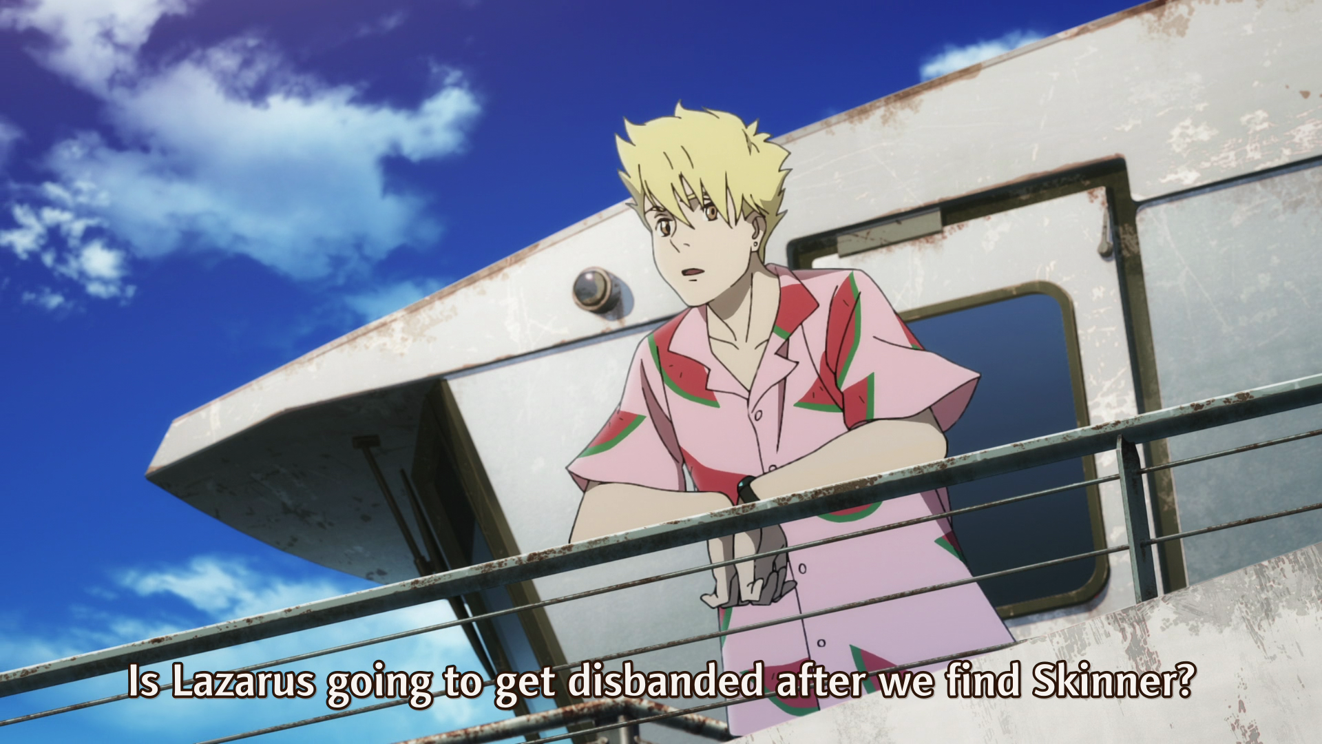 Episode 07 starts with news about the last of the Arctic ice caps melting (something Skinner predicted 3 years prior). Each of the islands Skinner purchased have sunk as a result of the ocean water levels rising over the last decade or so. The four Lazarus members come up empty handed in their search for clues but begin to wonder if the chase they are on is secretly guided by Skinner himself.