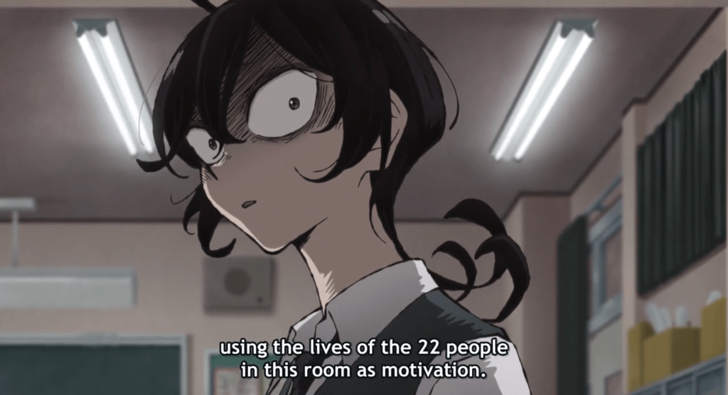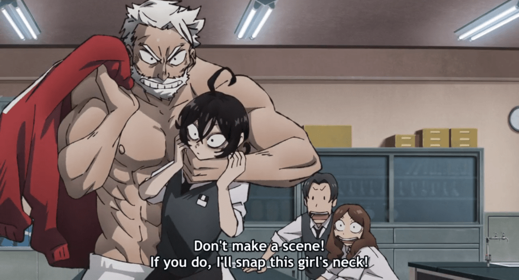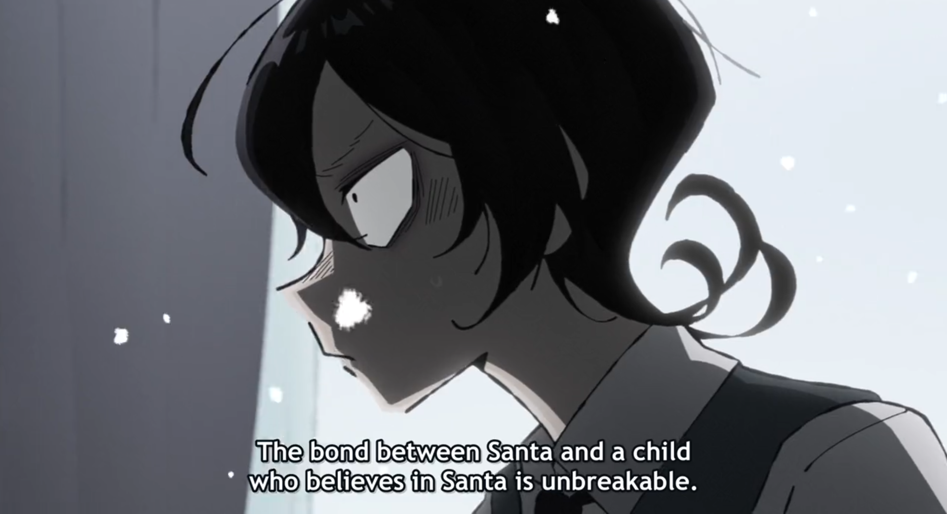 Fuyumura is convinced that her classmate Sanda is a descendent of Santa Claus. When she fulfills the conditions of his curse, he transforms into the jolly legend. Fuyumura wants to use his power to answer the wishes of children to help her find her friend Ono, who has been missing for months. She’s not content to just make the wish, however, but is instead driven to discover all of the abilities Santa has. By the end of the episode she’s discovered he can transform if he wears red, shrug off stab wounds nigh-instantly, return to his child form when he eats “Bratty Beans”, and is impervious to fire. She learns the last ability when a bomb she set in a classroom to test Santa’s ability to save children goes off. (The children had already evacuated).