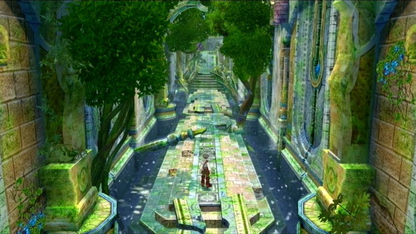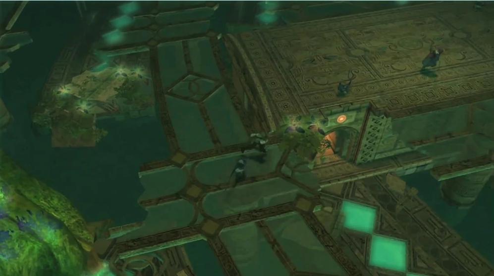 The area is still nice to look at, with a lot of water, trees growing through things, translucent platforms, and stonework with torches all around, but it’s a much dimmer area than we’re use to, and less variation in color and terrain. A lot more use of dark skills in combat.
